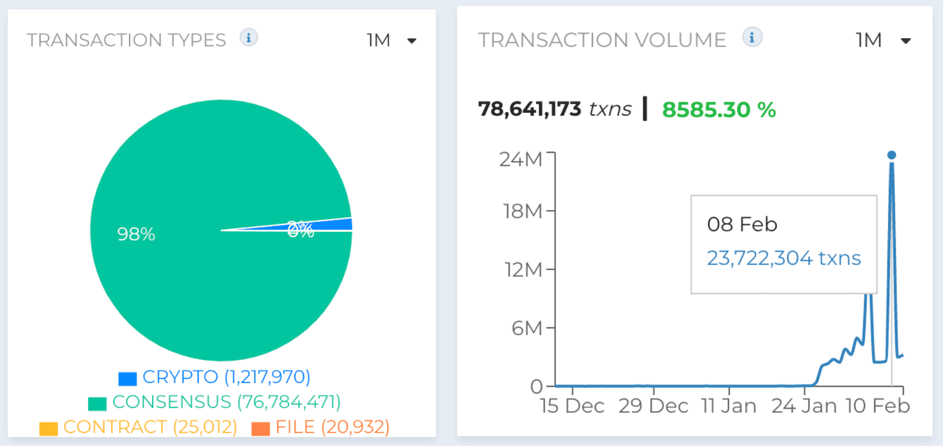 The graphics above were captured from the Hedera explorer DragonGlass (public testnet selected at the top) to showcase various transaction types and the transaction volume on Hedera Testnet from December 12th – February 10th. This volume increase is attributed to applications testing their HCS-powered applications on the testnet, as well as Hedera running performance testing.