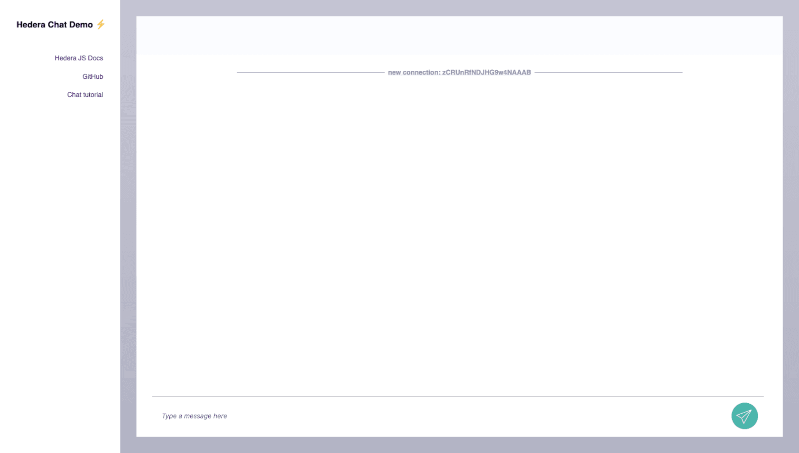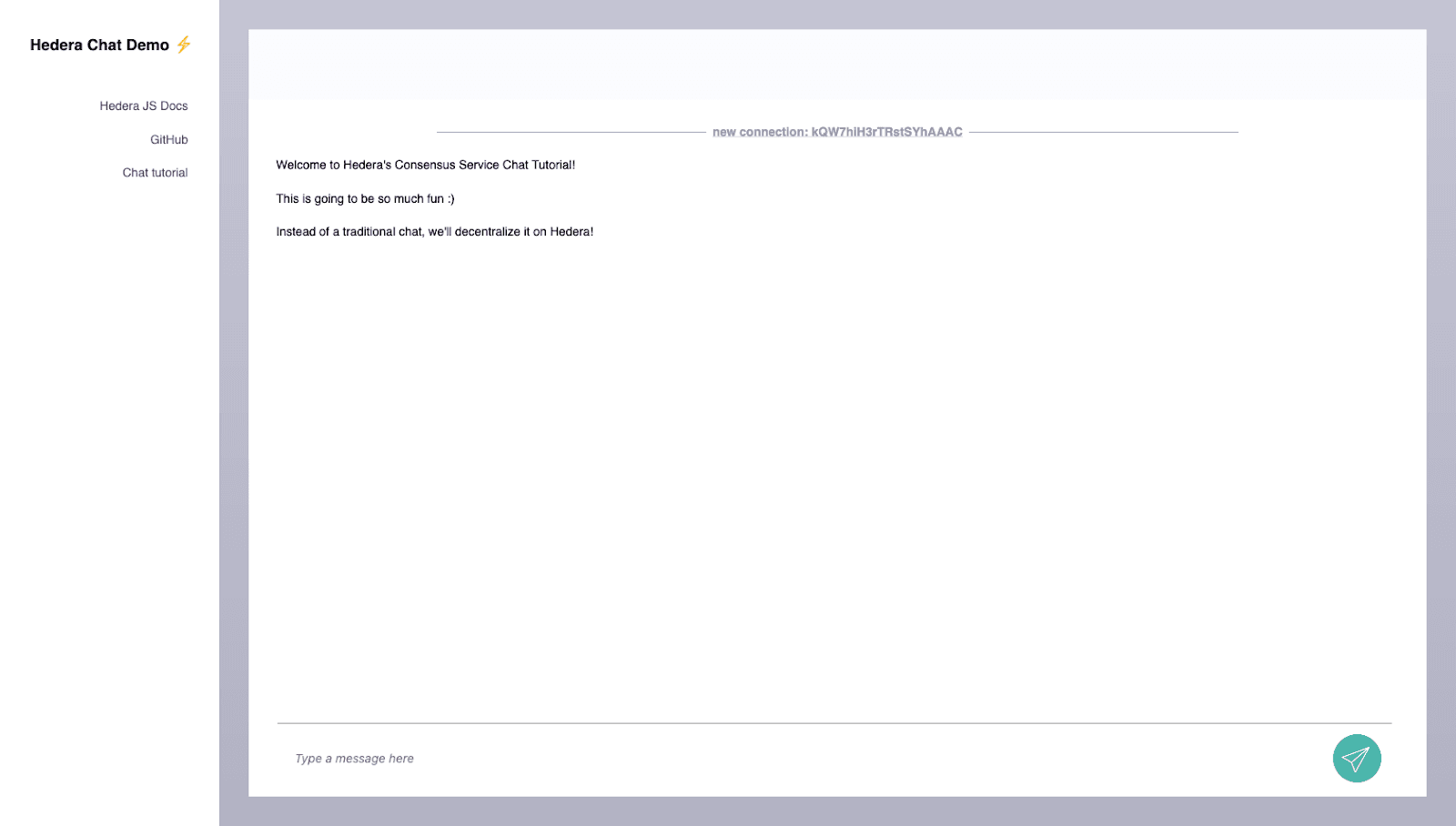 That’s great! Now whenever a user types in a new chat, it’s being sent over the Hedera Consensus Service.