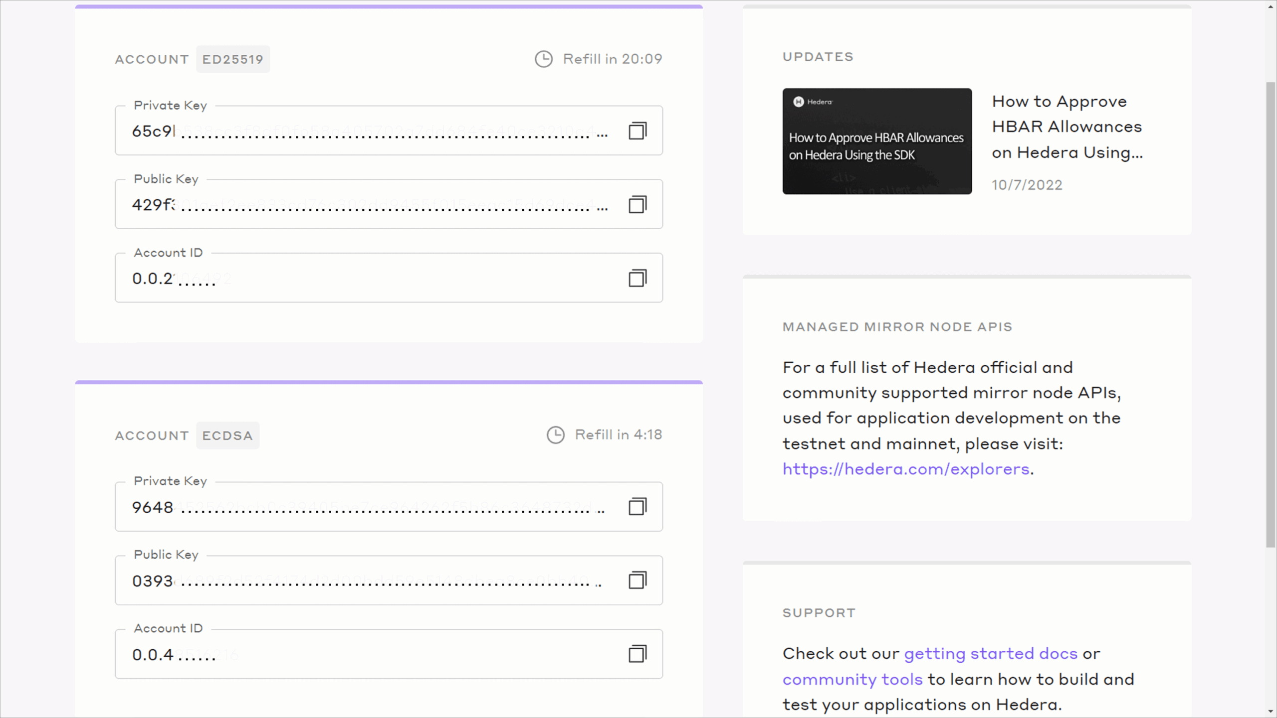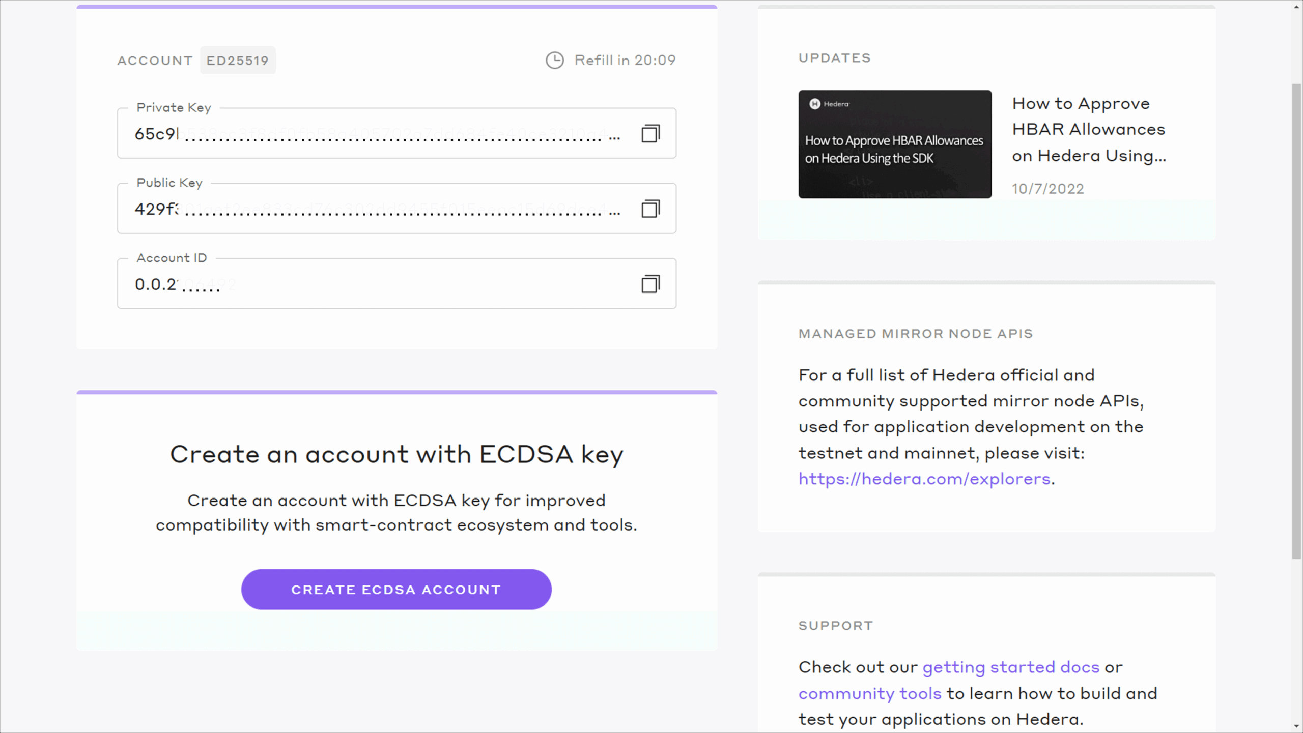 Once you create your first testnet account from the portal, that new account uses ED25519 keys by default. You can see the type of key used by the account at the top of the information box. The portal also shows you the amount of time remaining until the next refill to 1,000 HBAR for the account. After successfully creating your first testnet account, you should see something like this: