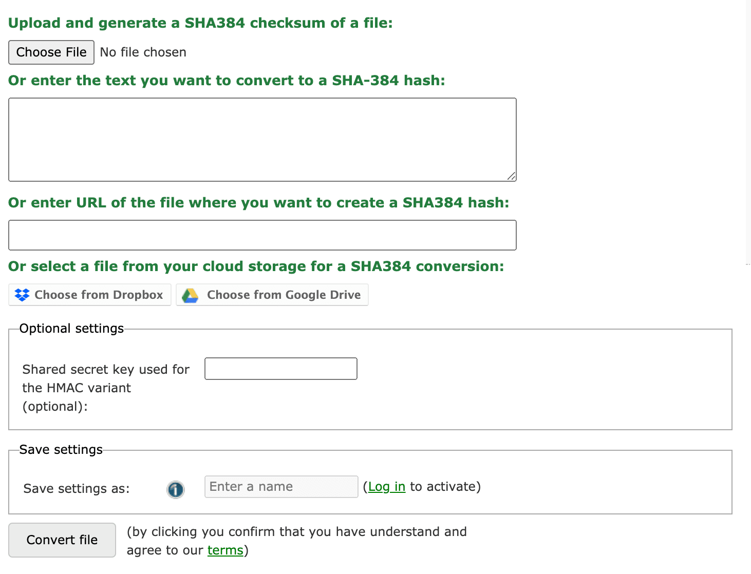 Next, you’ll need to generate a SHA384 cryptographic hash of this meeting minutes file. There’s an easy-to-use SHA384 hash generator found here. Upload the PDF and click “Convert File”. You’ll receive a SHA384 hash that you can then compare with the hash that has been generated by Trust Bucket and notarized with HCS.