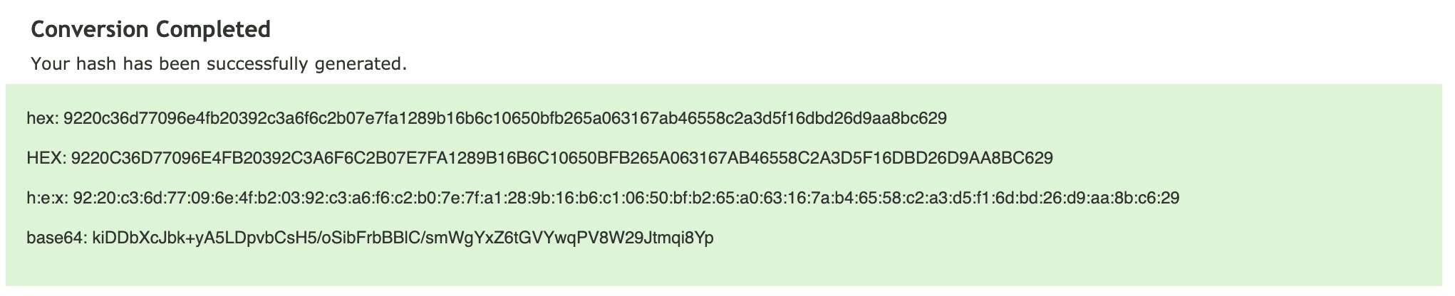 Once the conversion completes, you’ll receive your output as displayed below. The output we’ll use is “hex”.