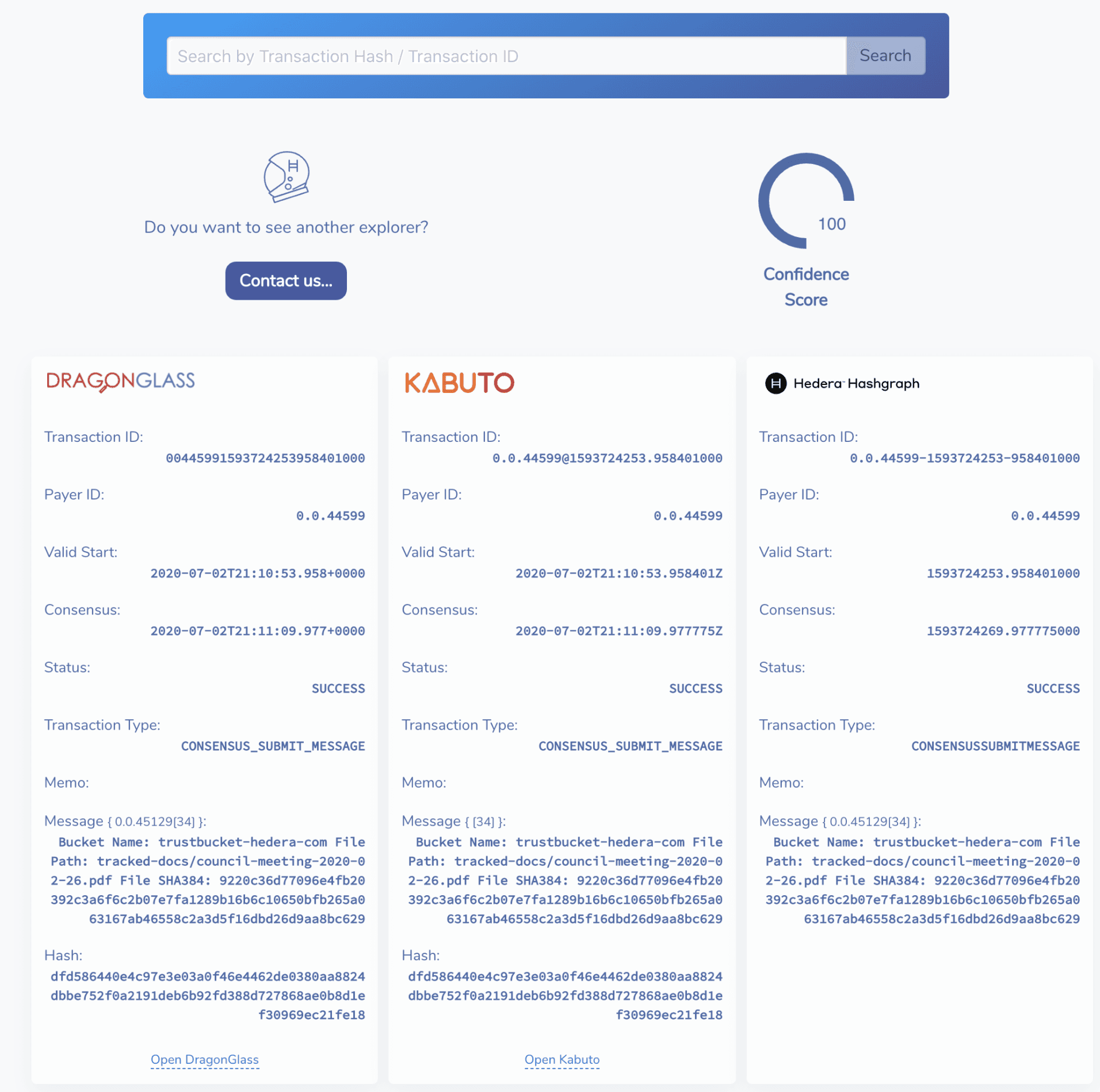 Back on the Council Meeting Minutes page, you’ll see a button labeled “VERIFY ON EXPLORERS” (this link is the same one found in the HCS TXN INFO, in the very last row). This tool aggregates transactions across multiple network explorers (this includes HashScan and DragonGlass); this ensures a strong confidence level in the information and is more decentralized than only verifying on one network explorer.