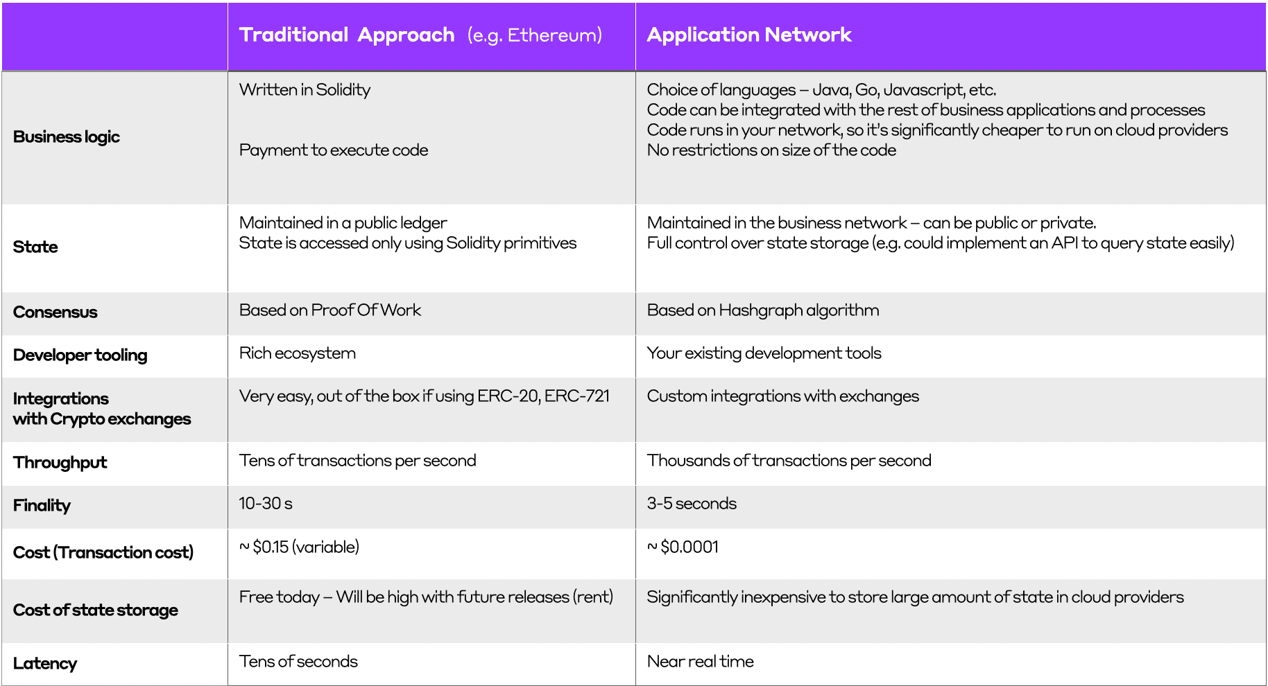 Before concluding, we wanted to compare and contrast the traditional smart contract approach to application networks on HCS.
