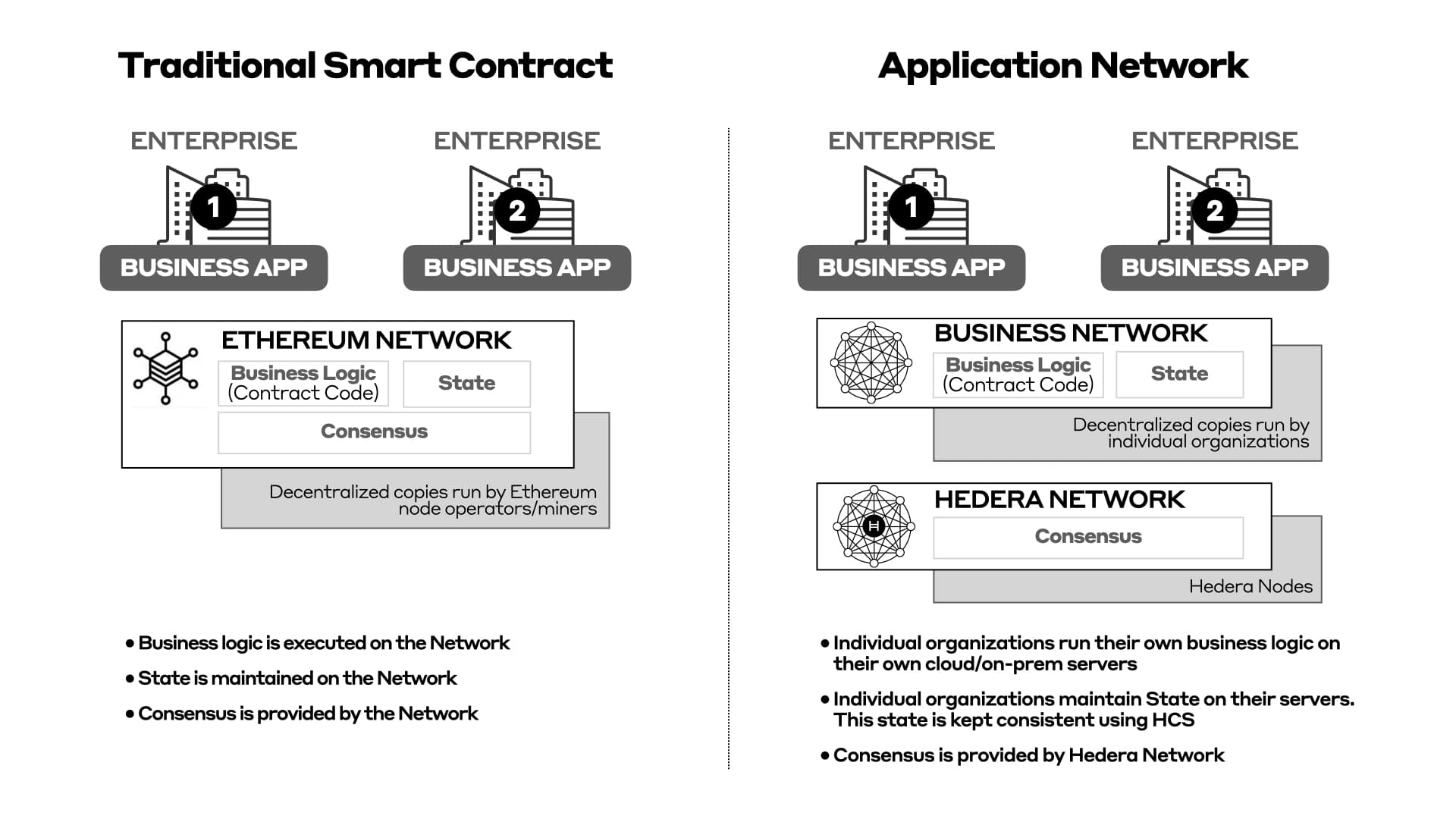 With an application network, the Hedera network only provides the consensus, the remainder of the application (execution, storage) is delegated to external resources, leading to more consistent costs and scale that can’t be achieved with the traditional approach.