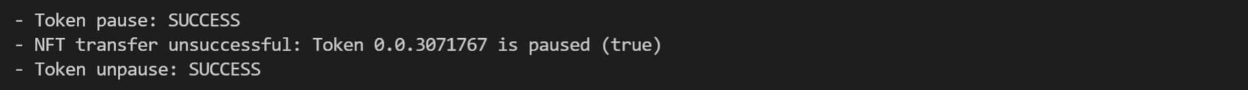 In our example below, we pause the token, test that by trying a token transfer and checking the token pauseStatus, and then we unpause the token to enable operations again.