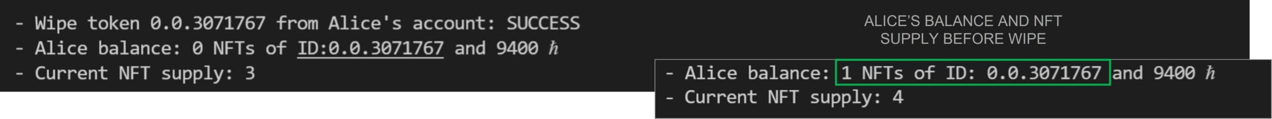 In this case, we wipe the NFT that Alice currently holds. We then check Alice’s balance and the NFT supply to see how these change with the wipe operation (these two values before the wipe are provided for comparison – see Part 2 for the details).
