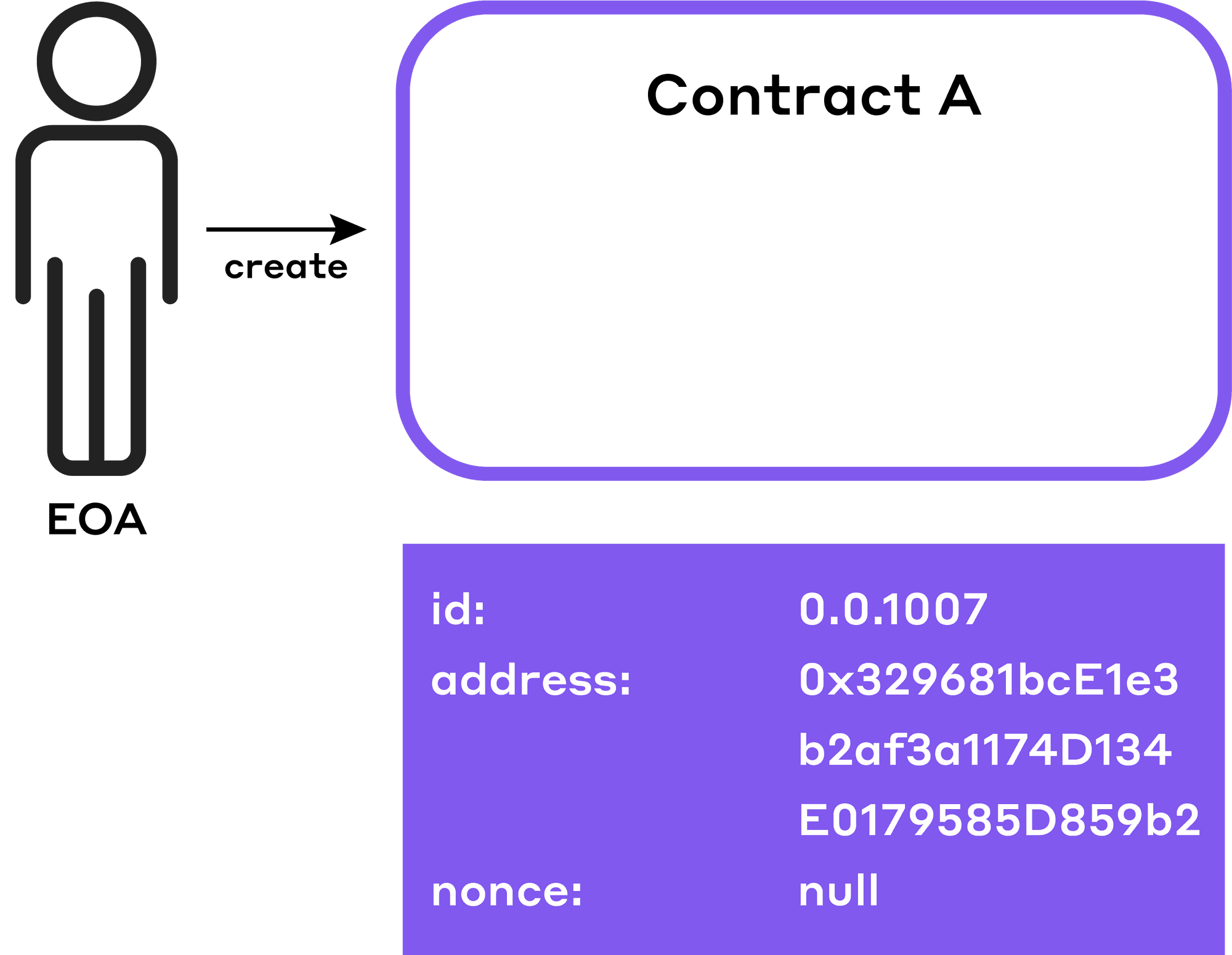 Originally, the nonce field targeted EOAs and not contract accounts, as such accurate contract nonce values were not available to support the CREATE operation as illustrated above. However, since Hedera provided a rich account identifier in the form of the <shard>.<realm>.<num> e.g. 0.0.1007, the HSCS was able to provide a data type-compliant solution known as the the account-num alias (fka long-zero address) that could be assigned to newly created contracts created by a contract.