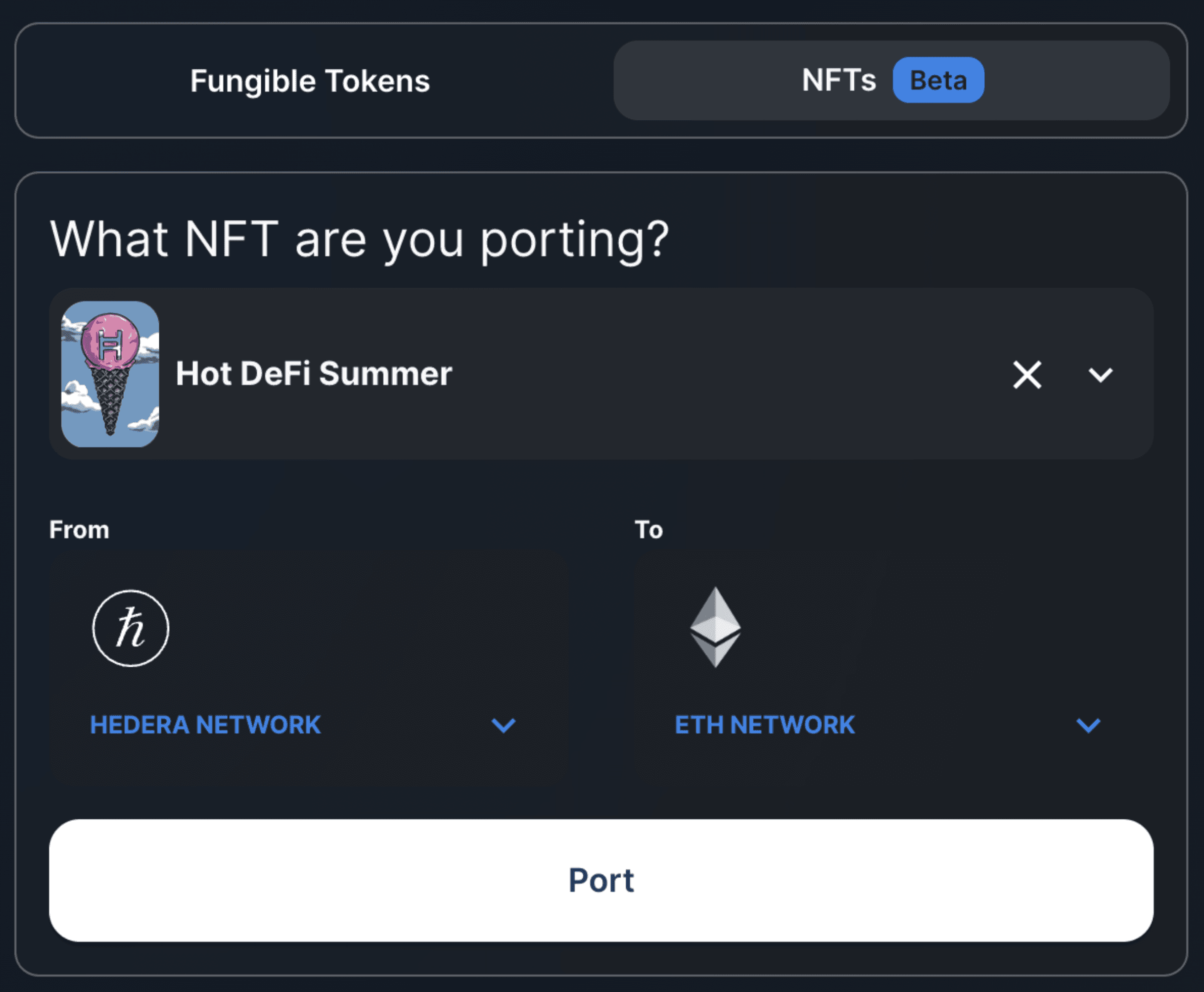 In the case of our NFT, we requested that its token ID be added, and the network validators approved our request. If you’d like hashport to consider your project’s assets for inclusion on the hashport bridge, please reach out to support@hashport.network.