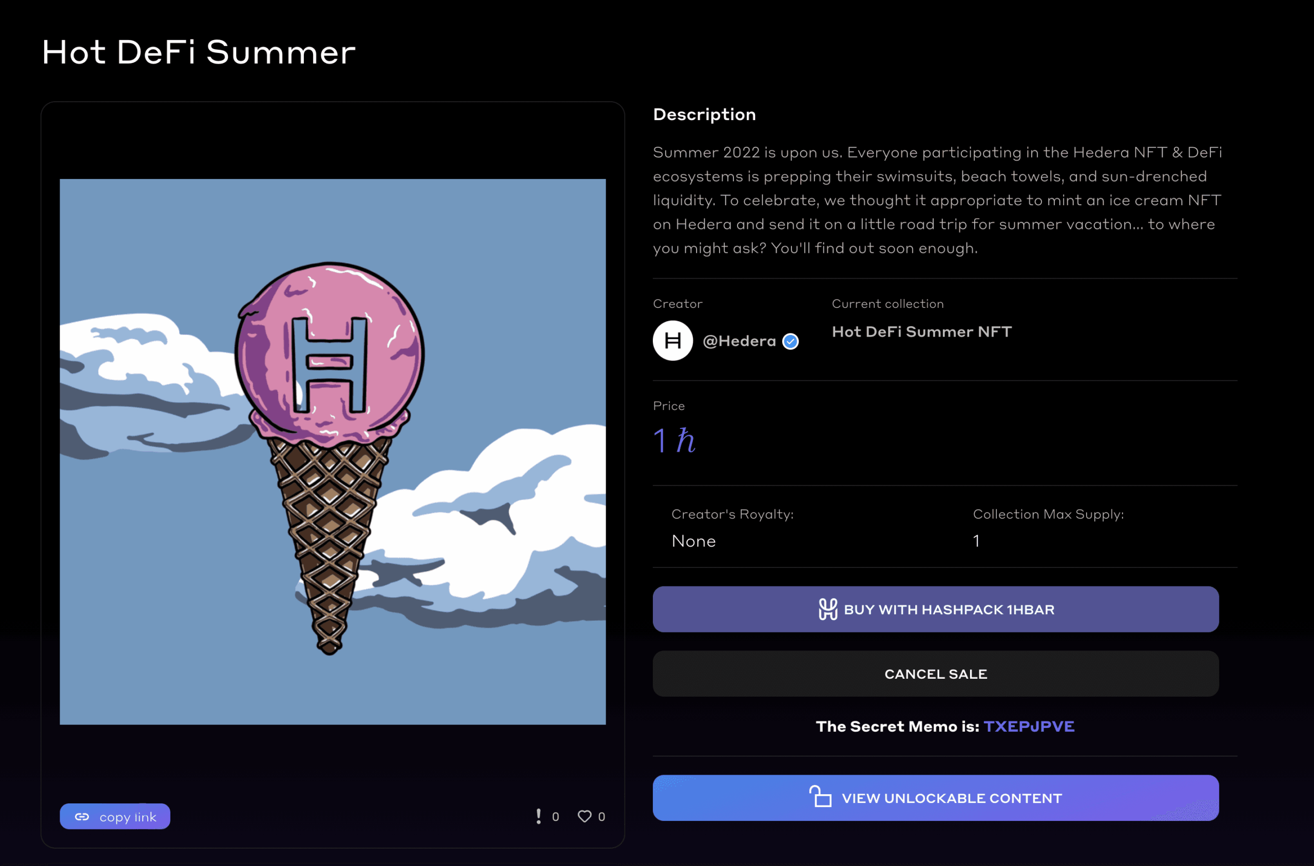 What’s a summer vacation road trip without snacks? On the first leg of our journey, we jumped into HashPack and cruised over to HashAxis (case study) marketplace to pick up our favorite snack: ice cream (aka creating an NFT collection and minting our very own Hedera ice cream cone).