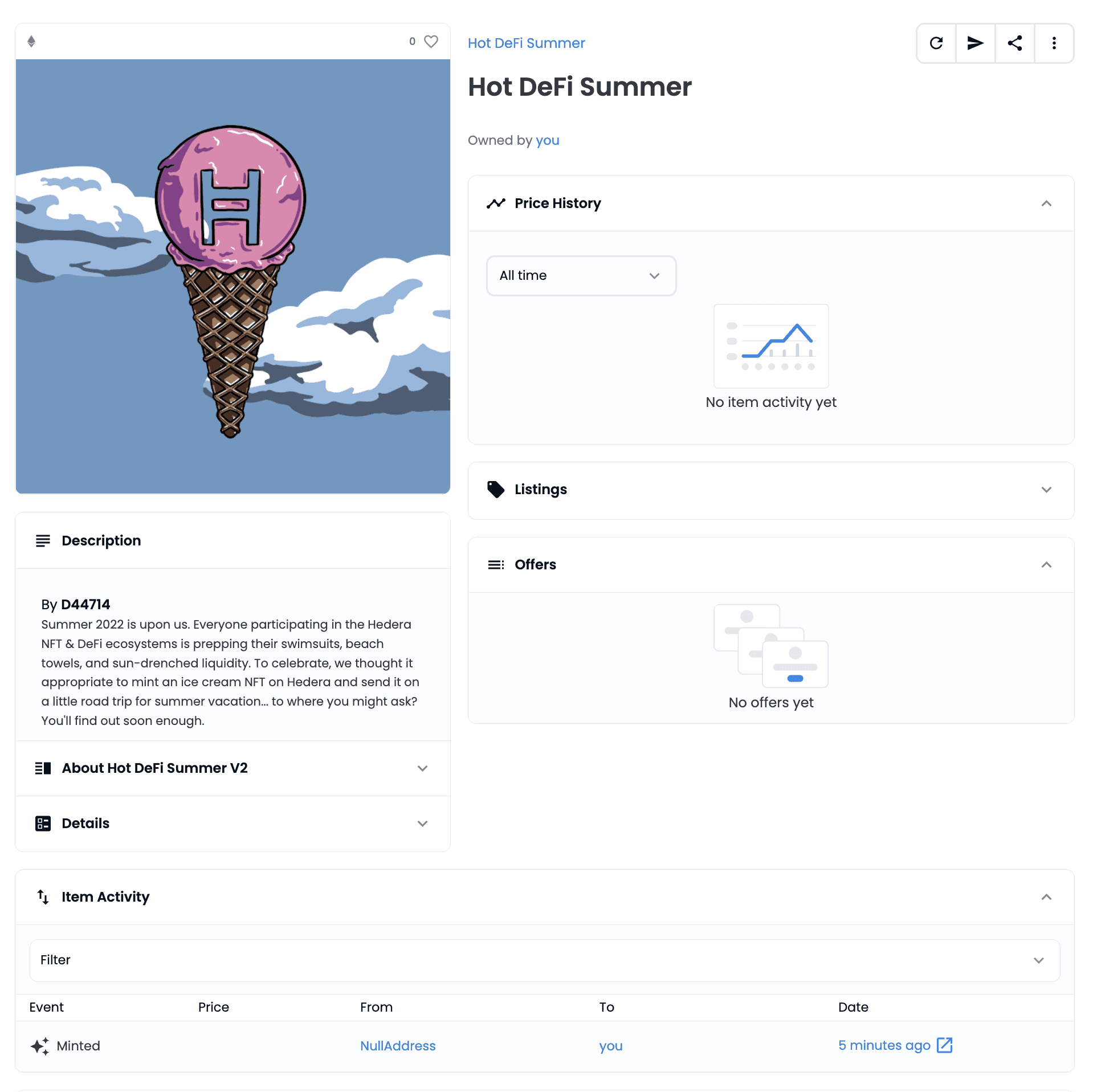 The “Hot DeFi Summer” NFT was successfully transferred to the Ethereum account used by hashport, and the metadata associated with the NFT is readable by both OpenSea and Twitter’s NFT profile picture functionality.