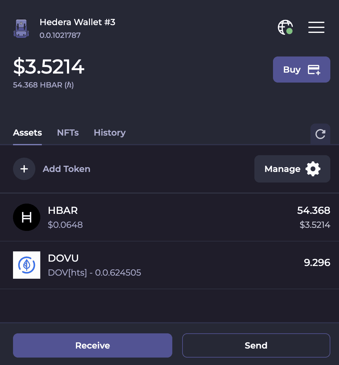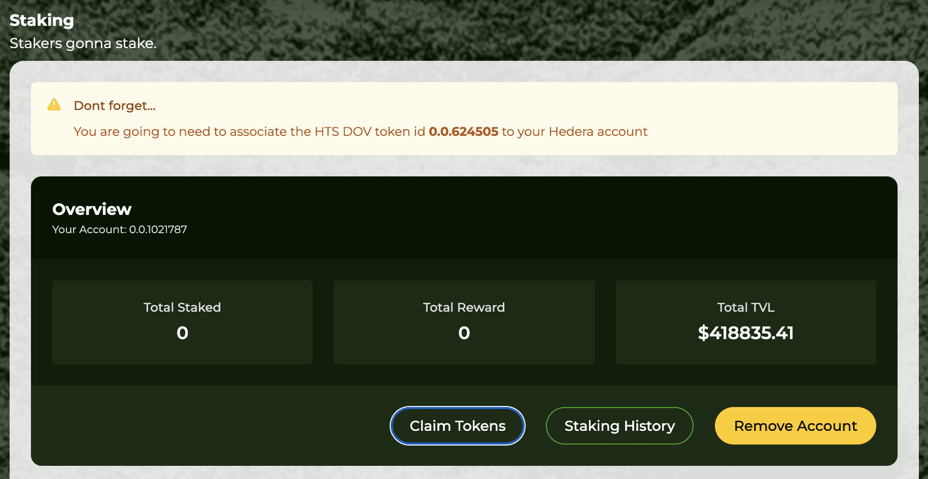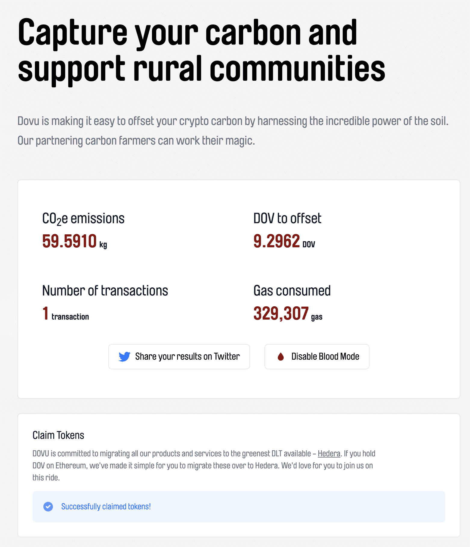 By participating in DOVU’s Operation Bloodmoon to bring more tokens to Hedera and assist in offsetting Ethereum’s environmental impact, we offset the carbon emissions of our Ethereum transactions by claiming $DOV tokens on Hedera for free. Upon clicking “Claim Tokens”, the application prompted us to sign up for DOVU and enter our Hedera account ID. $DOV tokens were then deposited directly into our Hedera account.