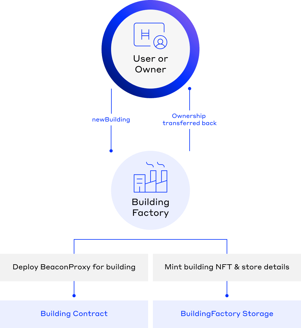 - A Building Factory automates the heavy lifting – deploying a building contract, minting the NFT, and more