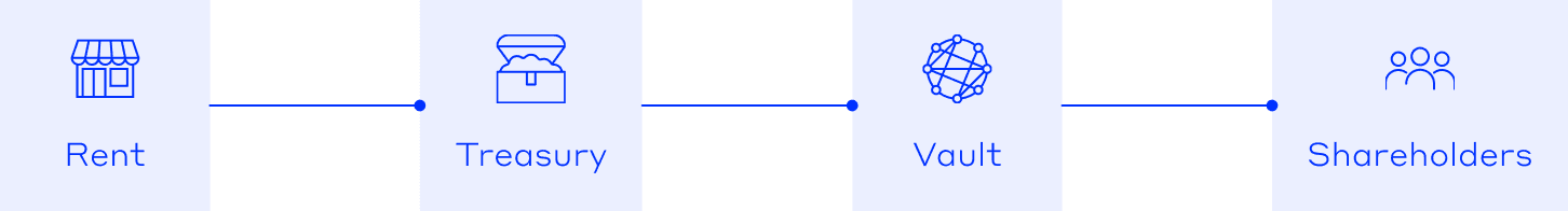 The Treasury holds reserves, pays invoices, and forward-routes rent to token-holders, while the Vault lets investors stake tokens and collect yield (e.g. rental or LP fees).