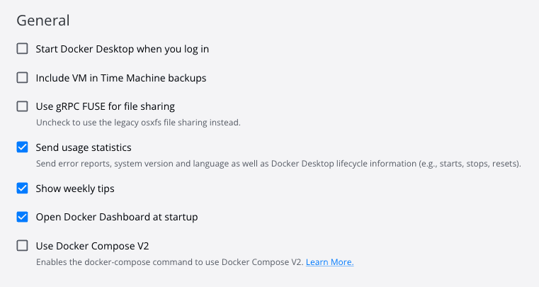 Once docker is installed go to Settings > General and ensure that use gRPC FUSE for file sharing is not checked.