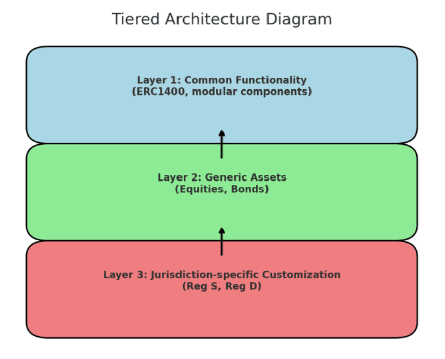 Layer 3: The third and highest layer allows for the customization of Layer 2 generic assets to meet the regulatory requirements of specific jurisdictions. This customization reuses all the generic functionality provided by the lower layers. For instance, U.S. regulations like Reg S and Reg D have been incorporated, with regulatory definitions stored on-chain. Some of these rules, such as Reg D’s “release hold period,” can even be enforced directly on-chain.
