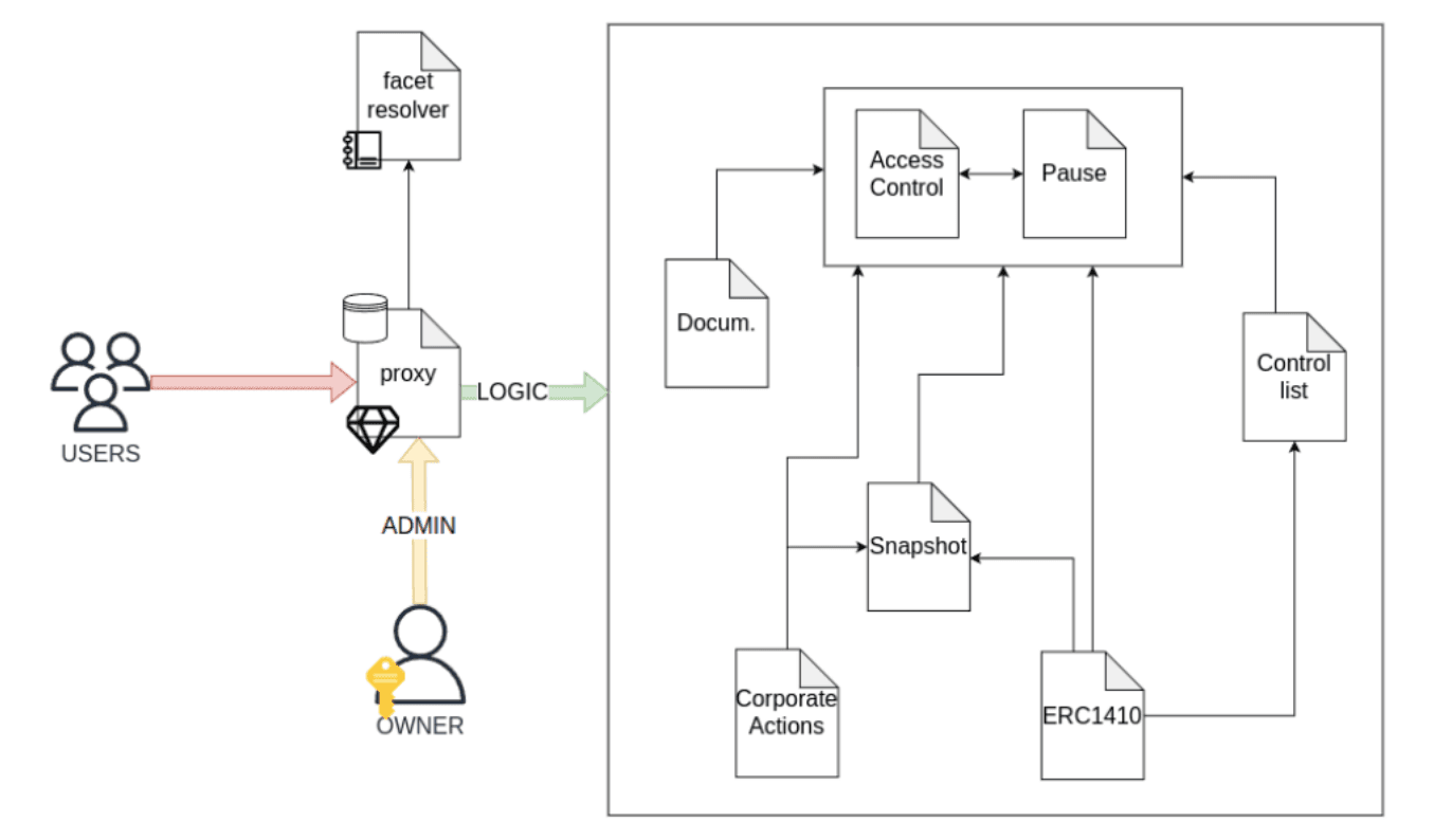 This pattern is very similar to the traditional diamond pattern, where a proxy delegates incoming calls to different implementation contracts, known as facets, based on the function selector of the incoming call. However, it introduces a key enhancement that makes it particularly suited for the Real-World Asset (RWA) use case, where potentially millions of assets may be deployed on-chain: unlike regular diamond proxies, the diamond loupe and diamond cut functionality are centralized in a single resolver smart contract. When a proxy receives an incoming call, it contacts the resolver to determine which facet it should delegate the call to.