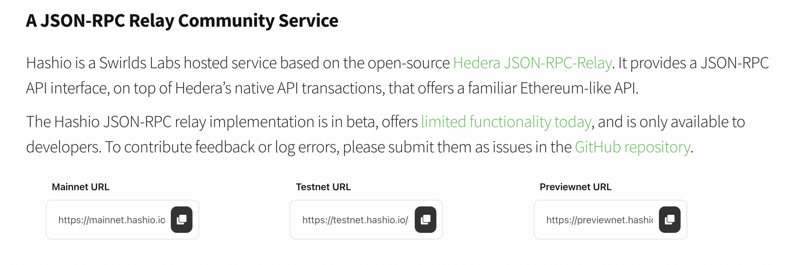 HashIO provides the URLs for each Hedera environment that will let you interact with the respective environment nodes on Hedera the same way you would an Ethereum node.