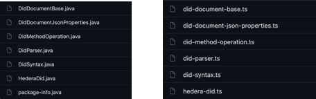 The main difference, of course, is the language-specific implementation of the Hedera DID method. An example can be shown below when diving into the DID Document Base (Java on the top and JavaScript on the bottom).