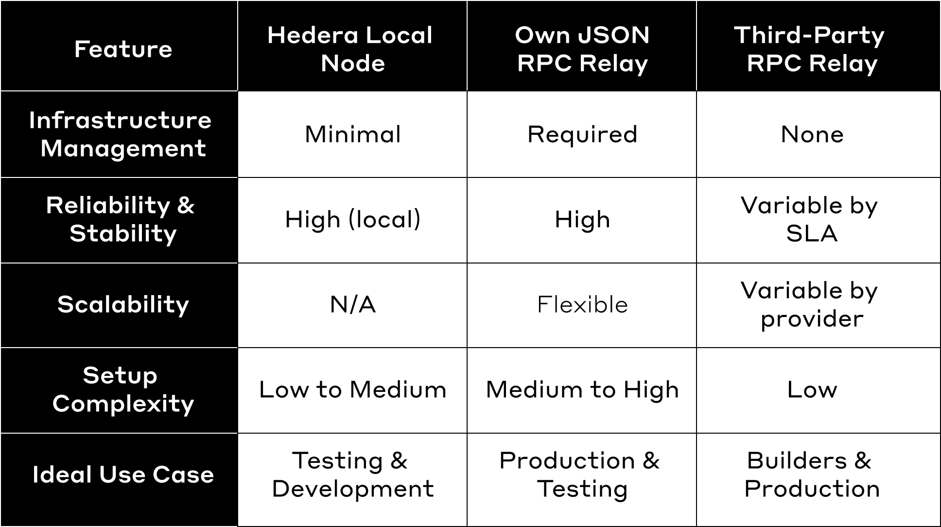 When working with smart contracts on Hedera, one critical decision developers face is how to set up their JSON RPC relay. This relay allows you to deploy, query, and interact with smart contracts on the Hedera network. Let’s compare three popular approaches to help you decide the best method for your project.