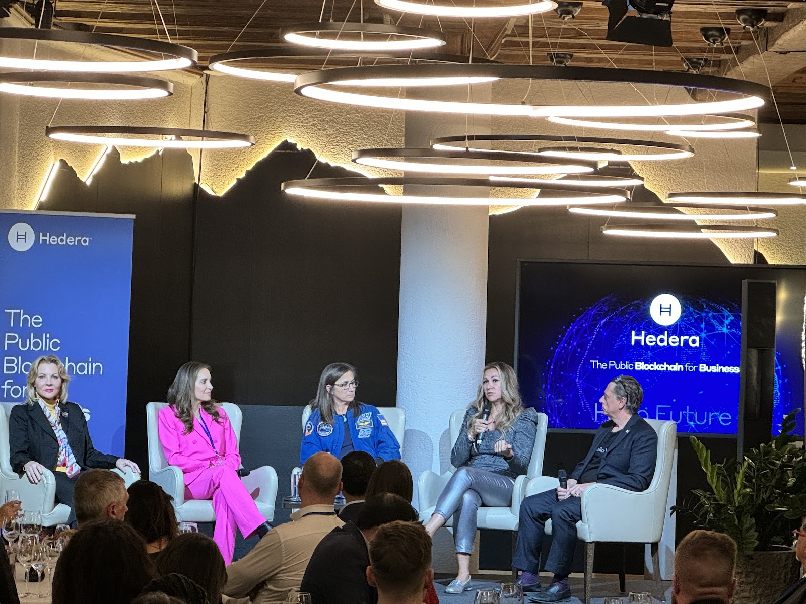 Dinner panel on Tokenizing Everything: From the Clothes on Your Back to Your Ticket to Space, moderated by Hedera board member Scott Thiel, with panelists (L to R) Shelli Brunswick, Sandra Campos, Nicole Stott and Christina Korp