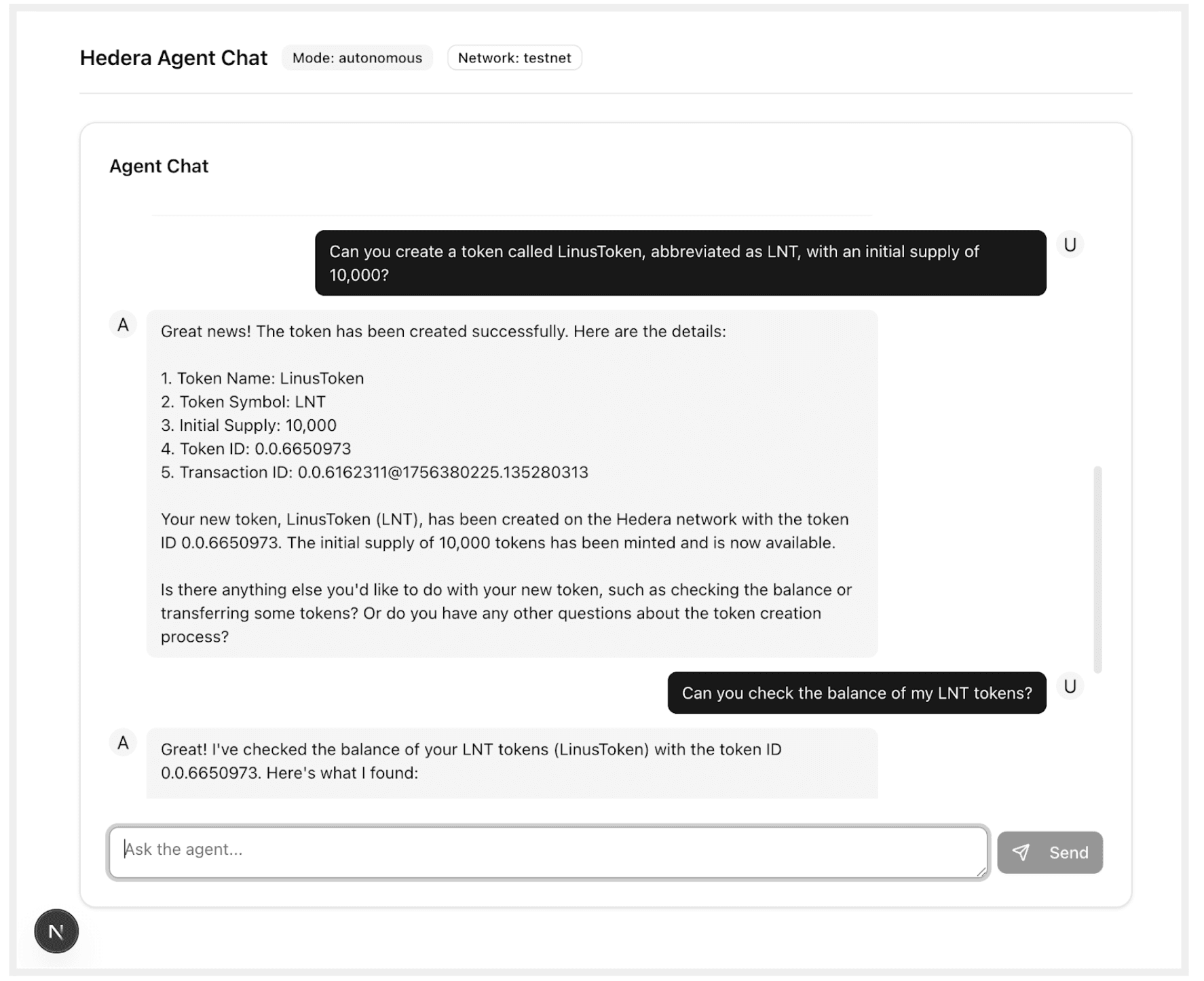 Once the configuration is complete, the app is generated automatically. From there, just switch into the app directory, run it locally, and you can start using natural language with your agent to complete transactions on the Hedera Network — getting from zero to a working AI-powered agent in minutes.