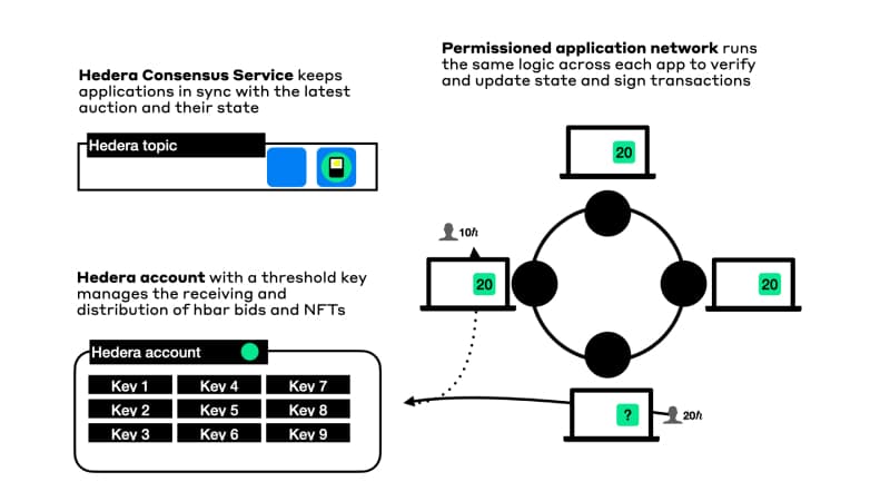 Each site runs the same application logic and uses Hedera Consensus Service to stay in sync with the latest auction. A Hedera account jointly owned by each site manages the bids and token transfer.